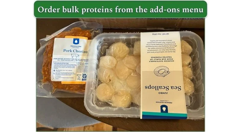 You can find extras catering to your needs in the Add-Ons section, too. You can prepare these in as little as 5 minutes. Some carnivore-friendly options might be sea scallops, boneless chicken breast pieces, and pork chorizo.