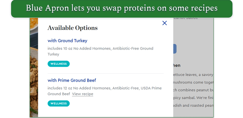 Blue Apron offers swaps and customizations on lots of recipes each week. You just need to look out for the Customize It text above the recipe name. When you open the recipe, you can see the swaps available and any upcharge associated with them. These customizations allow you to swap ingredients to suit dietary preferences. These are mainly protein swaps, so you can switch or upgrade.