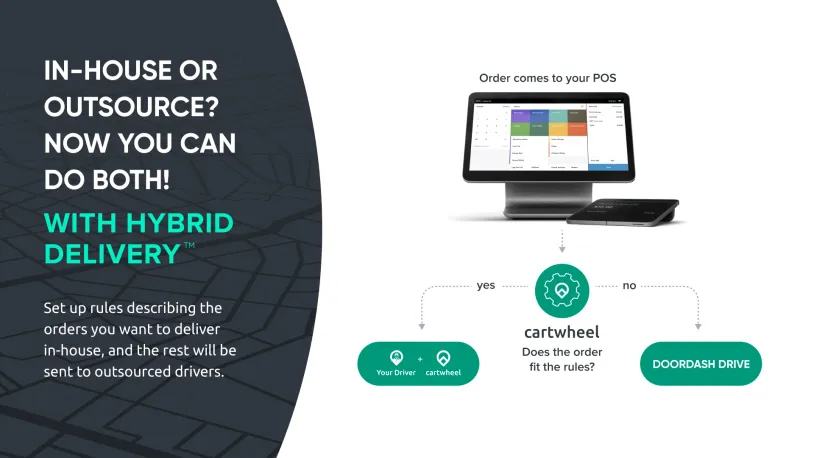- We offer Hybrid Delivery where restaurants can establish their rules in Cartwheel and based on these rules, we decide if their in-house driver takes the order or whether we send it to a third party.
