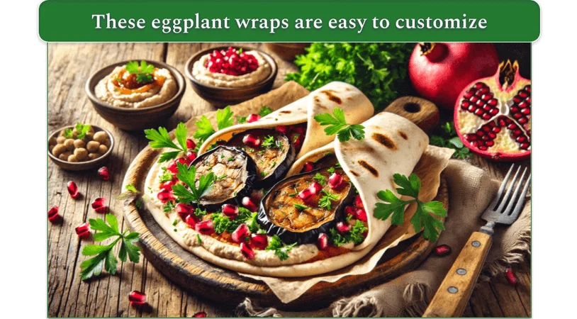 - Assemble the wraps: Warm the pita or flatbreads in the oven or on a skillet for a minute or two. Spread a generous layer of hummus on each flatbread, then top with roasted eggplant slices. Drizzle with the tahini sauce and sprinkle with fresh parsley.