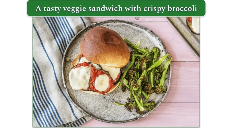 Eggplant Parm Sandwiches are a fun twist on a classic. The crispy eggplant, melty mozzarella, and tangy tomato sauce on a toasted brioche bun make every bite satisfying. Adding roasted baby broccoli takes it to the next level.