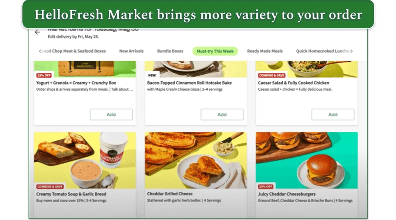 Subscribers can access the HelloFresh Market, where you can shop from a curated selection of quick-cook meal kits, breakfasts, lunches, snacks, desserts, and more. You can also purchase items to fill your fridge with, including fresh proteins and produce and ready-made spices and seasonings.