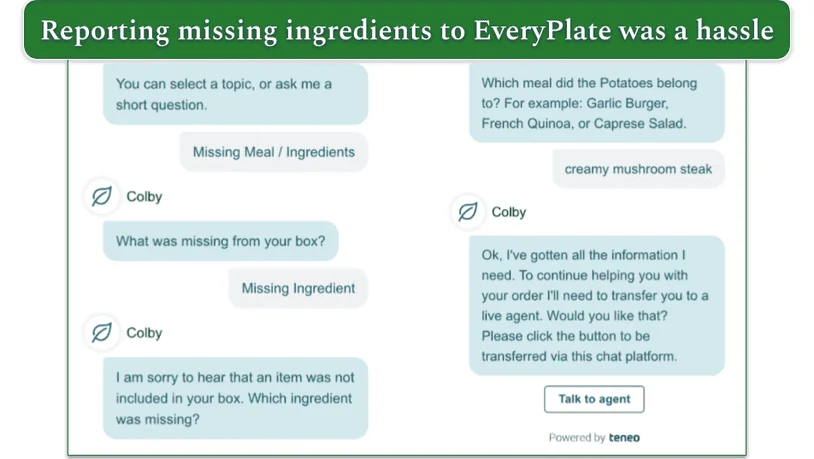EveryPlate’s customer service experience is slightly less user-friendly. Contact options are not as prominently displayed, requiring navigation through the FAQ section to access the support chat. The chatbot, "Colby," handles initial queries but frequently redirects users to the FAQ or requires additional steps to connect with a representative. While this process is not overly difficult, it feels like an unnecessary extra step compared to HelloFresh’s more streamlined approach.