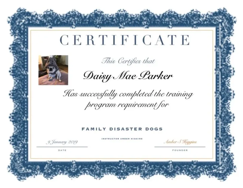 One of my favorite stories is of Daisy Mae, a senior pug from Washington state who became an FDD at the age of 12. She helped her human mom and grandmother be prepared for disasters including carrying her own doggy evacuation backpack. Even though Daisy has crossed the rainbow bridge she’s still a well-known social media dog influencer to this day. Pictured is her FDD certificate.