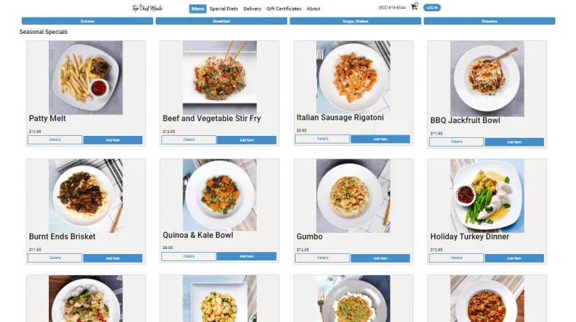 Top Chef Meals has over 80 different meals to choose from and with the added choice of side dishes, thousands of combinations are possible. We also serve hearty breakfasts, healthy and sinful dessert options, as well as soups, and even smoothies.