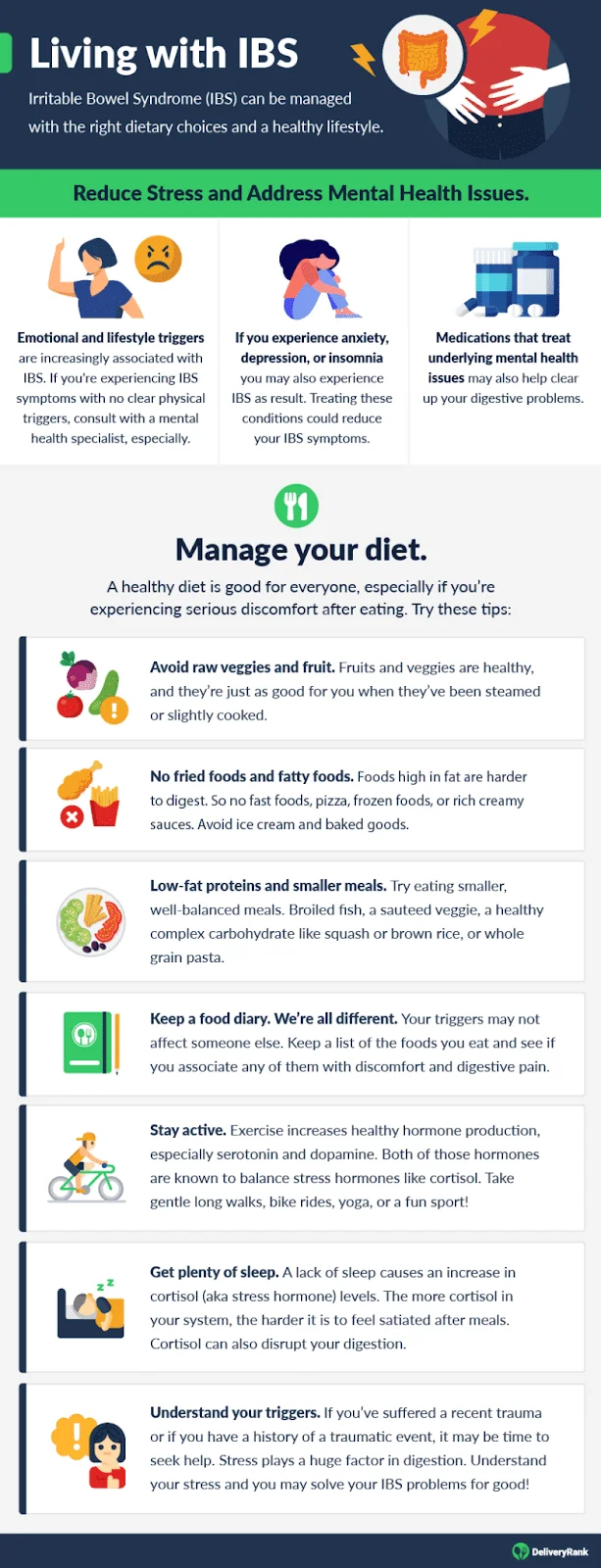 Doctors may give you a series of tests to rule out other health conditions (including Crohn’s, celiac disease, food intolerances, and other digestive disorders). If the symptoms persist after establishing the patient doesn’t have an underlying condition, the doctor will likely discuss lifestyle and diet adjustments to manage IBS.