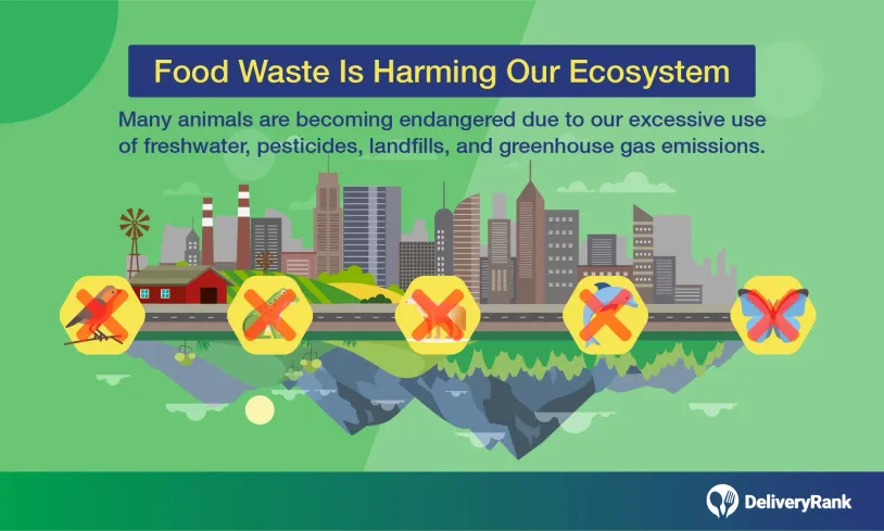Food waste is having a drastic effect on 10 species in particular, because of our overuse of freshwater, pesticides, greenhouse gas emissions, use of landfills, and growing food production. The 10 most endangered species by food waste are: