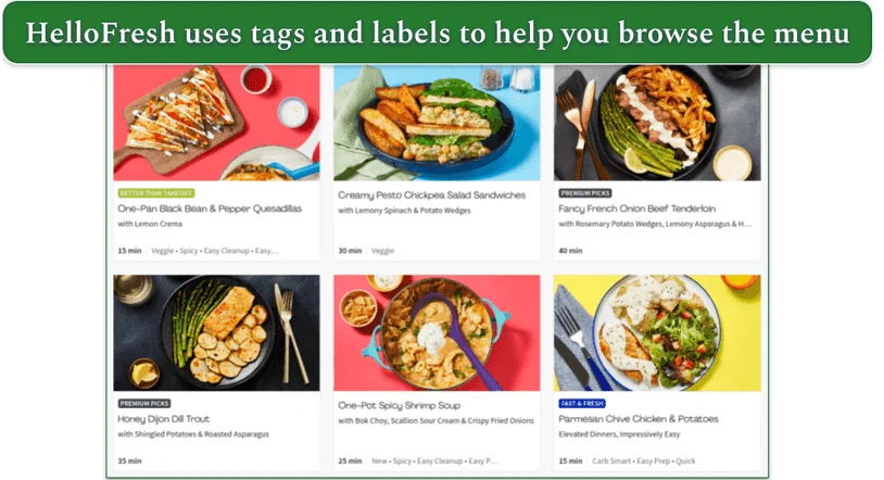 HelloFresh also uses labels to identify specific categories of meals. For instance, popular meals are marked with Hall of Fame, top-quality recipes are labeled Premium Picks, while low-prep meals bear labels like 10-Min Lunch or Fast & Fresh.