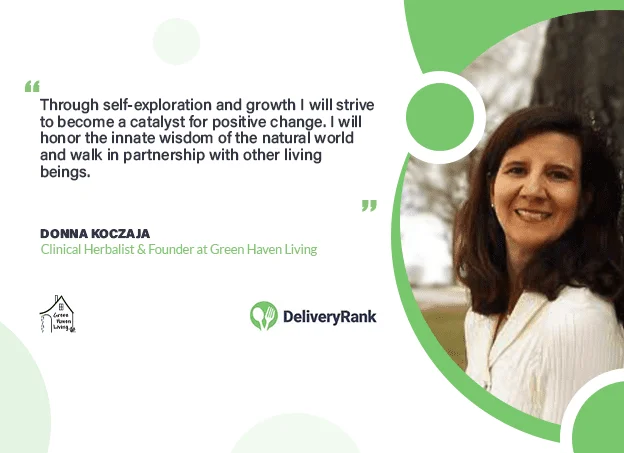 Embark with Delivery Rank on a holistic journey to well-being with Donna Koczaja, a trailblazing Clinical Herbalist and the visionary force behind Green Haven Living. In a world where health is often fragmented into isolated symptoms, Donna Koczaja stands as a beacon of integrative healing. As the founder of Green Haven Living, she has redefined the path to wellness by delving beyond the surface and addressing the core of ailments. With a profound commitment to clinical herbal medicine, Donna works in tandem with you, unraveling the intricate tapestry of your well-being to uncover the very roots of your discomfort. Green Haven Living is not merely a wellness practice; it's a haven where personalized care flourishes. Through tailor-made herbal formulations, dietary insights, and lifestyle recommendations, Donna collaborates with you to craft a comprehensive strategy that nurtures every facet of your being, promising not just a remedy, but a remarkable enhancement in your overall quality of life.