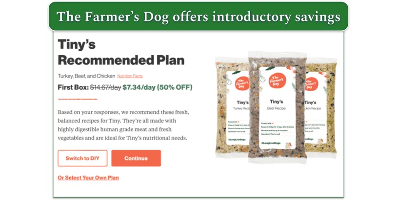 - Factor in subscription options and discounts: Look for subscription plans that offer savings on recurring orders. Many services, including The Farmer’s Dog, provide discounts for first-time buyers or multi-month commitments.