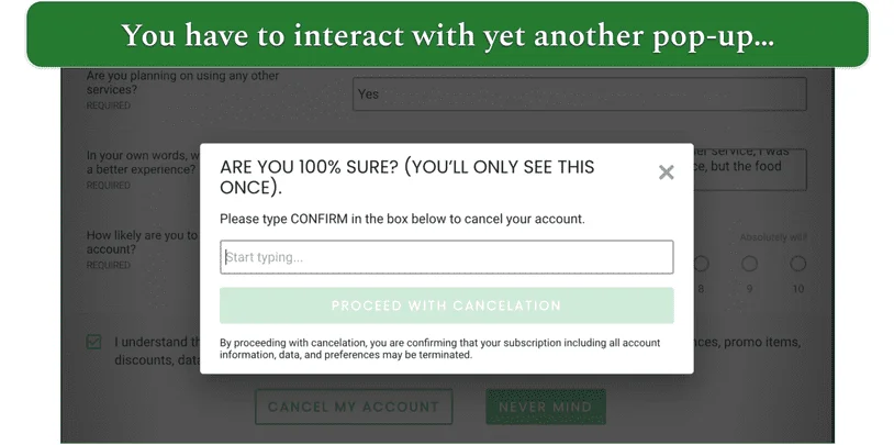 - Complete the questionnaire and cancel pop-ups – Fill out the survey. You may have to close several pop-ups during this process. When you’re finished, hit the Cancel My Account button, type “CONFIRM” in the final pop-up, and press the Proceed with Cancelation button. Finally, you’re canceled!