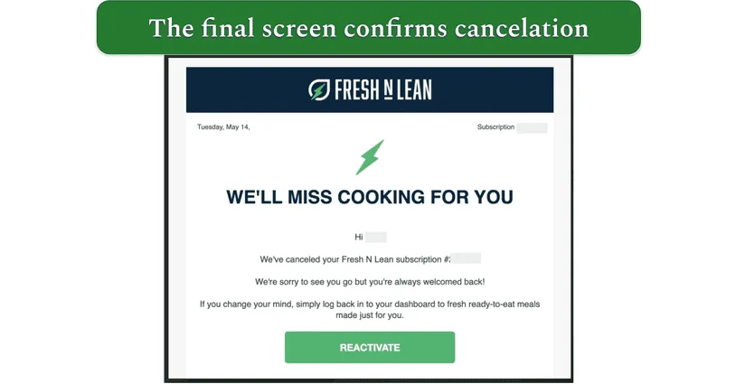 6. Your subscription is canceled. You’ll see a final confirmation screen with a Reactivate button, and you’ll also receive a confirmation email. Make sure to cancel your Fresh N Lean subscription before the cutoff time of 11:59 pm PT, otherwise, your next order will already have been processed and you’ll receive the next box.