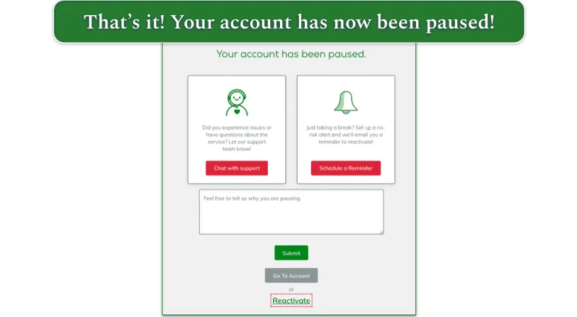 - Pause your account – If you wish to proceed with the cancelation, click on the Pause Your Account option to initiate the process. It's important to select the indefinite pause option to ensure the cancelation remains in effect until you decide to reactivate your account.