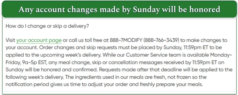 All cancelations (or other changes) must be made by 11:59 pm EST on Sunday prior to the delivery for the upcoming week. The Customer Service department is open Monday through Friday, 9 am to 5 pm EST, but as long as a cancelation request is received before the Sunday deadline, it’ll be honored and confirmed.