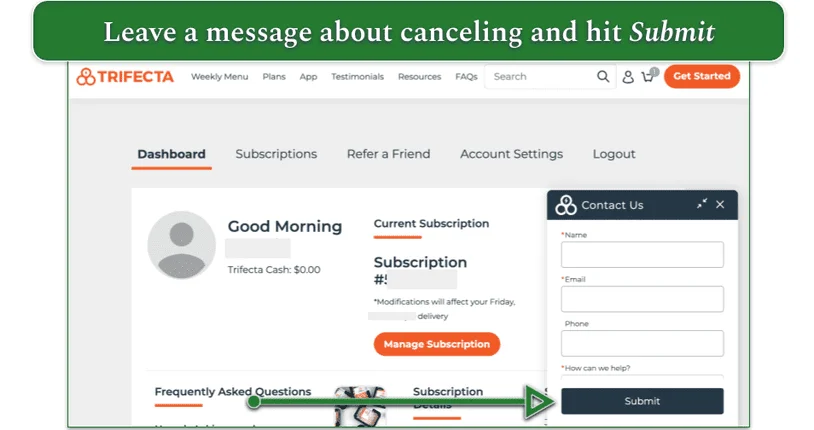 2. Speak with an agent or leave a message – Live chat operates 8 am - 5 pm PST. However, even if you contact Trifecta during those hours, a customer support agent may not be available. If this happens, you’ll be prompted to leave a message instead. In the email field, include the email associated with your Trifecta account. In the “How can we help?” field, submit a statement saying you want to cancel your subscription. When finished, hit Submit.