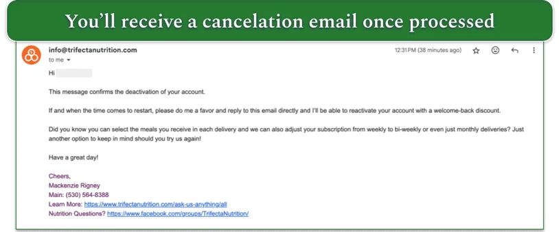 You need to reach out to customer service to cancel your account, as we found out the hard way when we tested Trifecta. You can contact them by phone, live chat, or email.