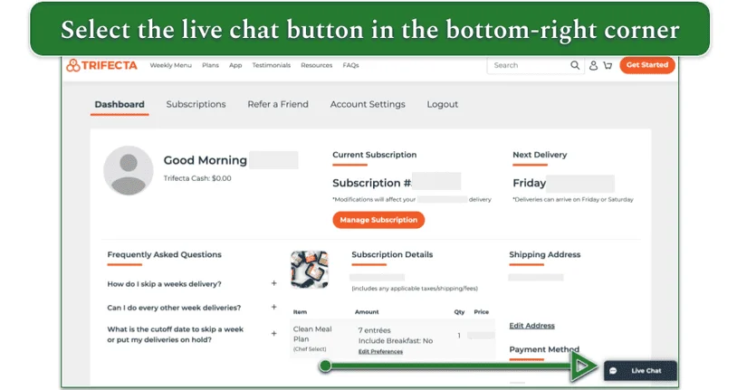 1. Access live chat – Sign into your account and navigate to your dashboard. This is optional, but it will allow you to check when your next order is due. Be sure to cancel before Friday at 11:59 PM PT (the Friday prior to the scheduled delivery). In the bottom-right corner, click on Live Chat to open the window. You can also access live chat on the Trifecta site without signing in.