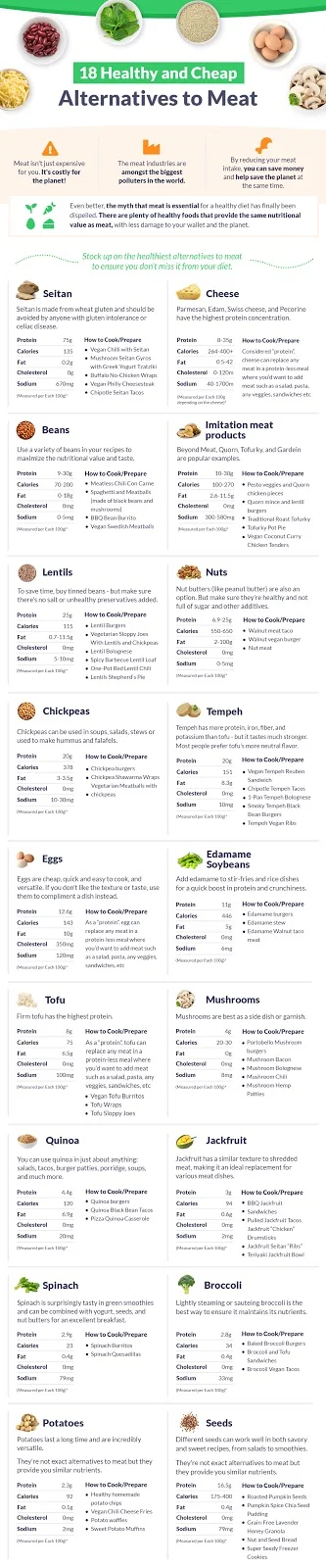 Use the guide below to find cheap, healthy alternatives to your usual meat. Swap these into your favorite dishes and meal planning.