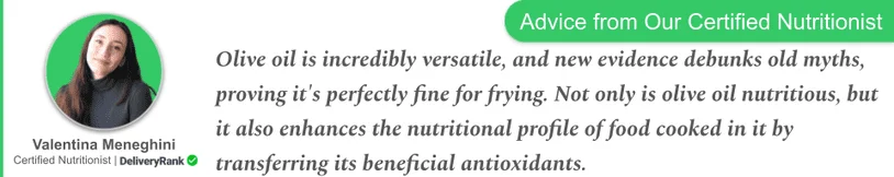 When stir-frying, it’s perfectly safe to fry with EVOO or any other type of olive oil due to the high content of monounsaturated fatty acids and antioxidants, which keep it stable even at high temperatures. EVOO is safe for frying, but the light or pure types of olive oil have higher smoke points, making them more suitable for the high temperatures required in stir-frying. Extra virgin olive oil has a smoke point of around 410 °F⁴, which can lead to burning and an unpleasant taste and can lead to the formation of harmful compounds that may increase cancer risk⁸.