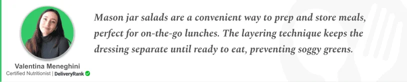 Mason jar salads are a convenient and efficient way to prepare and store your salads. This makes them perfect for meal prep and on-the-go lunches. The layering technique ensures that the dressing stays at the bottom, preventing the greens from getting soggy. They're also portable, easy to store, and can be made in advance, saving you time during busy weekdays.