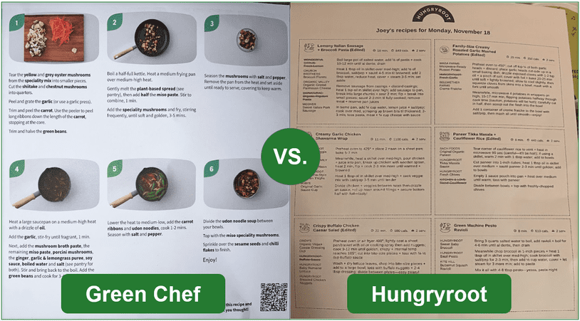 However, I recommend taking the cooking times specified on the recipe card with a grain of salt. First, Hungryroot recipe cards are quite minimalist, which can be challenging if you’re new to cooking. Green Chef offers more detailed instructions, but it also has more complex recipes that can be difficult for beginners.