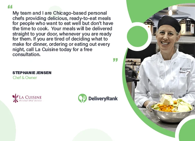 La Cuisine, led by Stephanie Jensen and her team, is a Chicago-based personal chef service dedicated to delivering scrumptious, ready-to-eat meals to individuals who desire nutritious and flavorful food but lack the time to prepare it themselves. DeliveryRank has the pleasure.