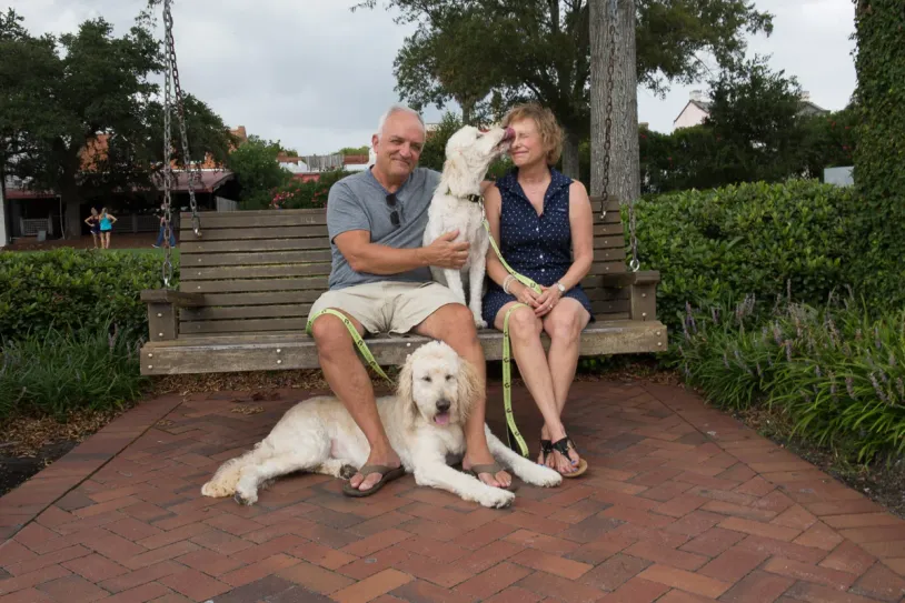 I currently have two Goldendoodles, Leo and Molly. Molly weighs 51 pounds and Leo is 53 pounds. He will be taller than his sister and loves to snuggle. Leo is our “velcro” dog while Molly loves her space!