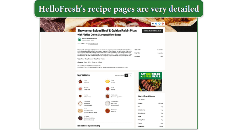 HelloFresh also has a more detailed nutritional values section. Each recipe features detailed information not only on the main macronutrients and calories but also on saturated fat, sugar, cholesterol, sodium, and more.