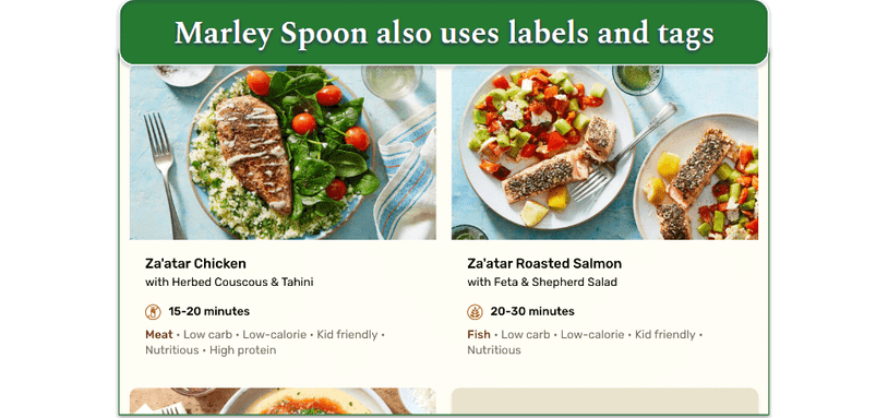 Marley Spoon’s menu is just as large, but it’s easy to filter using a wide range of dietary and lifestyle tags. These include Healthy Choice, High Protein, Keto-Friendly, Kid Friendly, Low Calorie, Low Carb, Low Sodium, Mediterranean Diet, Vegan, and Vegetarian, along with filters like Gluten Free Friendly and Dairy Free.