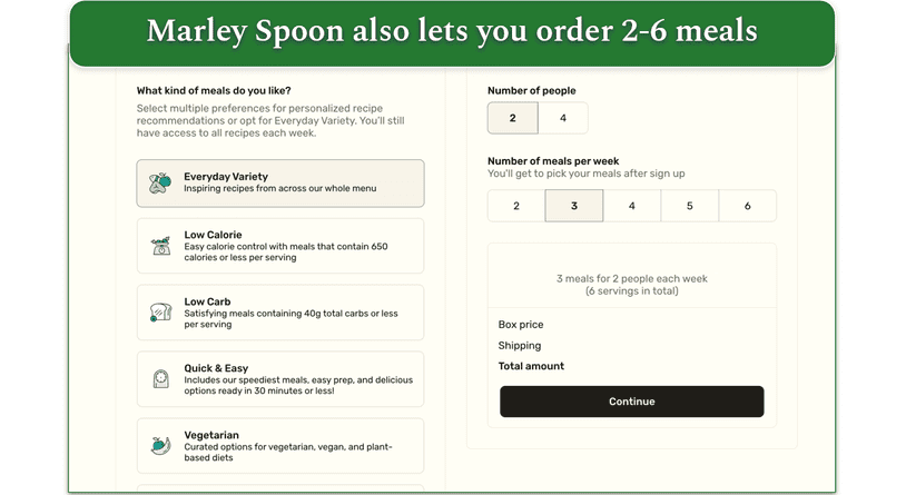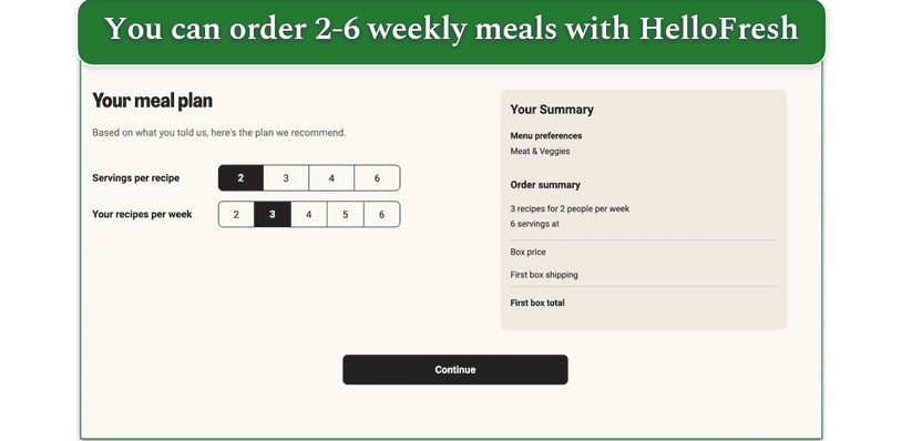 Both Marley Spoon and HelloFresh offer flexible meal plans with your subscription. HelloFresh has plans for 2, 3, 4, and 6 people, and you can order between 2 and 6 meals per person per week. This makes HelloFresh better for larger families.