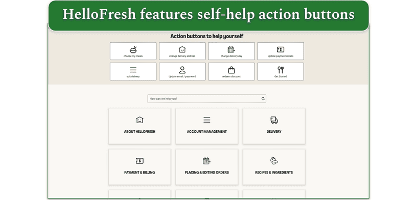 Both FAQ sections are searchable and offer well-detailed information on a wide range of topics. Also, HelloFresh features several self-help action buttons that’ll help you perform various account management tasks, such as changing your delivery address, updating payment details, or editing a delivery.