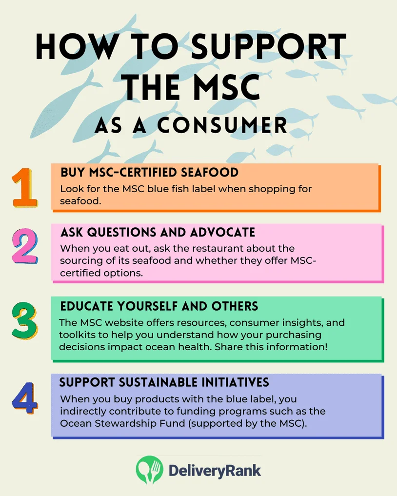 MSC helps promote sustainable fishing businesses. Products bearing the MSC blue fish eco-label show they come from a fishery that meets the MSC's standards for sustainable fishing. This allows buyers to choose eco-friendly options, participate in the fight against overfishing, and support marine health.