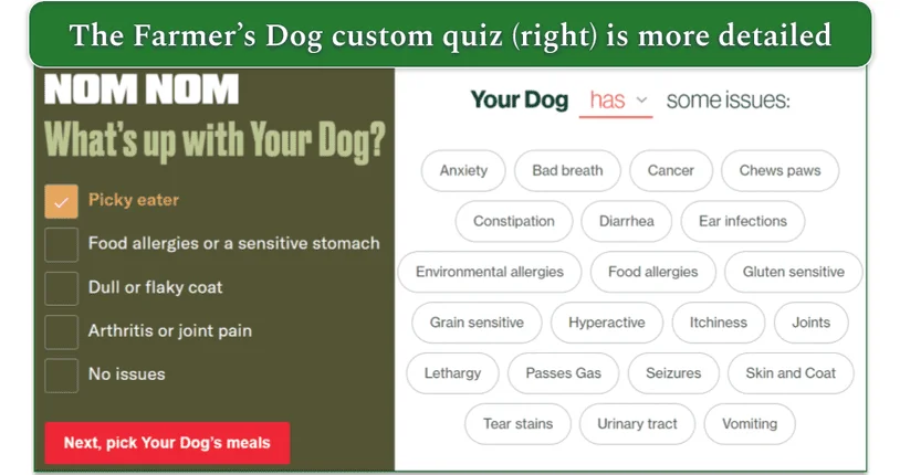 - Compare recipes: Nom Nom and The Farmer’s Dog offer the same proteins with similar recipes. The Farmer’s Dog has a more in-depth questionnaire with more detailed advice on which specific recipe to serve your dog.