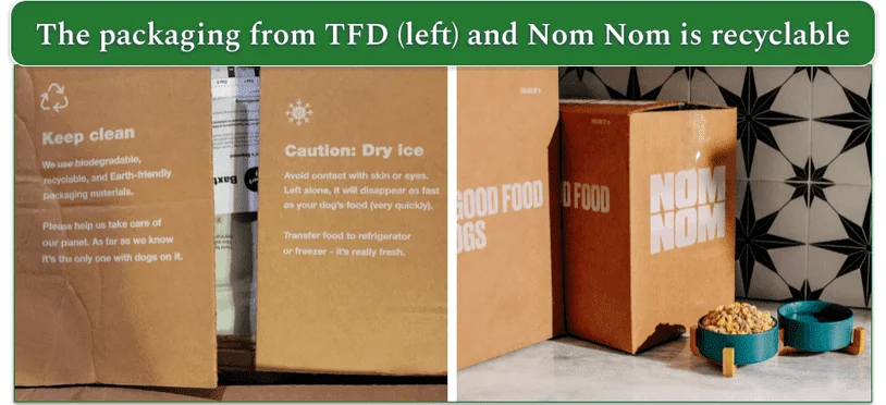 Both companies also make a point of using only environmentally-friendly packaging. Every material in your Nom Nom’s box is either recycled or recyclable. The Farmer’s Dog’s cardboard box, insulation, and food storage container are biodegradable (you can compost them if you want), and all the packs are made from non-toxic, BPA-free materials.