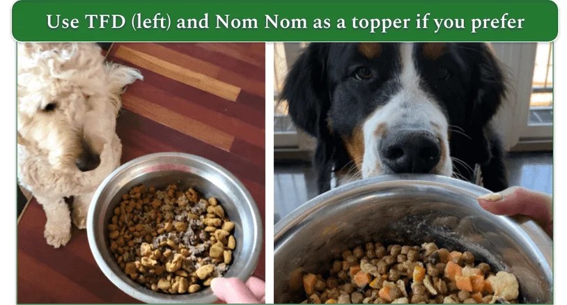 You can feed The Farmer’s Dog and Nom Nom as a topper instead of a full meal. This can benefit your dog by adding extra nutrition to their regular kibble. It also makes it more budget-friendly, which is great if you have a large dog or more than 1 pup.