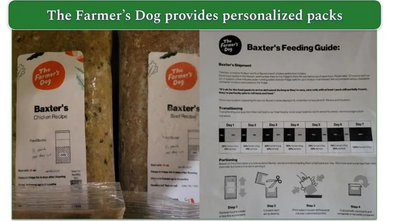 The Farmer’s Dog sends each meal with your dog’s name on it. My colleague was very impressed with the reusable biodegradable feeding tray and instructions on how much to feed your dog and on transitioning from your old dog food. Check out our The Farmer’s Dog review to find out more.