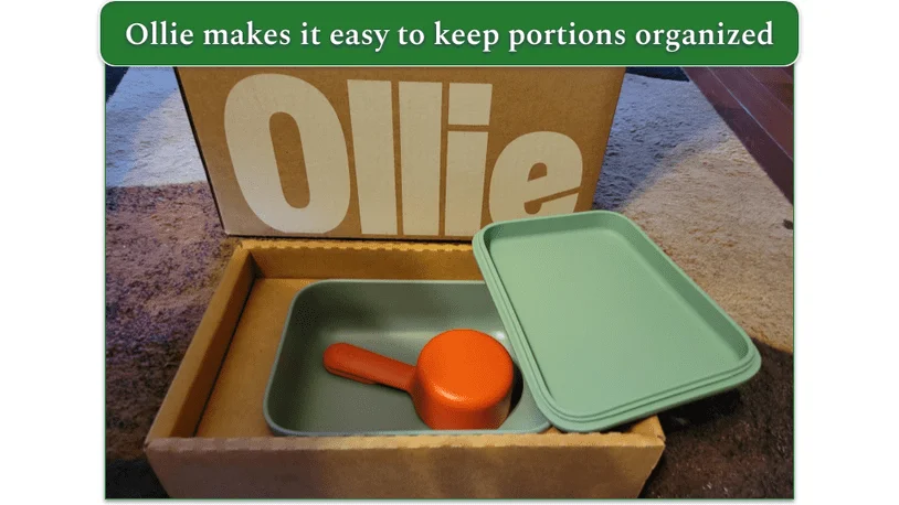 Ollie’s first order includes a dishwasher and microwave-safe storage container. If your dog only takes part of a pack at 1 meal, you can put the rest aside in your refrigerator for tomorrow. Ollie even includes a scoop with its meals to make things easy.