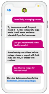 A patient could query Ina® and ask for an easy-to-prepare recipe that won't irritate mouth sores, or for a list of foods that won’t exacerbate diarrhea. The beauty of the platform is that we start out with a profile that the patient provides to us, then we base our personalized interventional guidance on this.