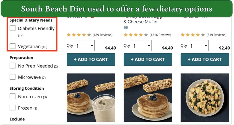South Beach Diet once offered a wide range of dishes. Even in its prime, however, it was limited in terms of dietary preferences. There were no diet-specific menus, but you could use the Special Dietary Needs filters on the breakfast, lunch, and dinner menus to find diabetes-friendly and vegetarian options.