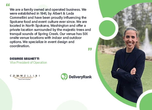 DeliveryRank has the opportunity to chat with Desiree Seghetti, Vice President of Operations for Commellini Estate, a cherished family-owned business that has been an integral part of the Spokane food and event culture since 1941. Situated in the scenic surroundings of North Spokane, this private venue offers six unique indoor and outdoor event spaces to choose from.