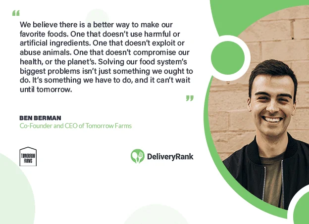 Tomorrow Farms is a company that is committed to transforming the food industry by providing a better, more sustainable, and healthier way of making our favorite foods. They believe that the current food system is riddled with problems, such as the use of harmful ingredients, exploitation and abuse of animals, and compromise of our health and the planet's health. DeliveryRank chats with Ben Berman, Co-Founder and CEO of Tomorrow Farms.