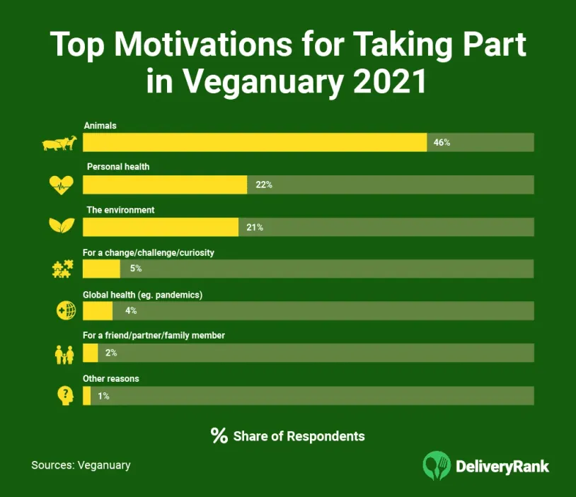 Of those that participated in Veganuary, 46% said they did so because of animal rights concerns. The second most popular motivator was personal health, with 22% of people stating this as their top concern, followed by environmental concerns at 21%.