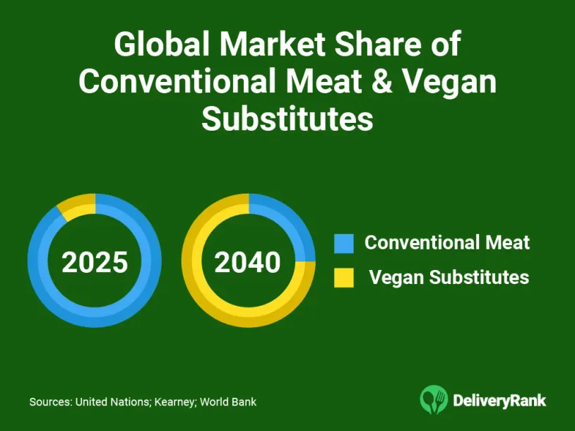 The market share of conventional meat is expected to decline from 90% in 2025 to 40% by 2040. Vegan meat alternatives are on the opposite trajectory. The market share of vegan substitutes is set to reach 10% in 2025, rising to 25% by 2040.