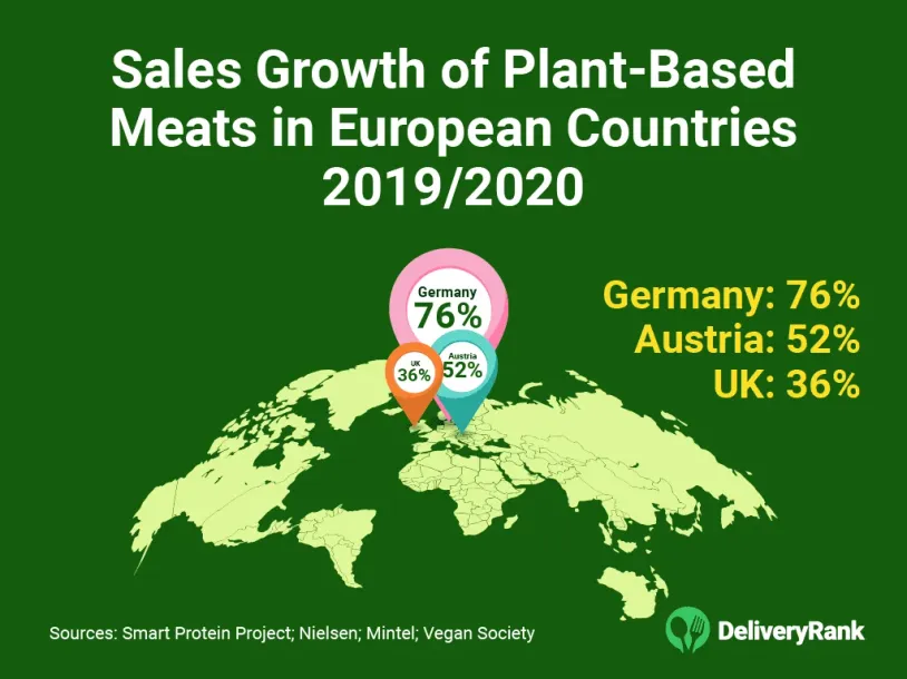 Germany, Austria, and the United Kingdom are the leading European nations that have seen substantial growth in the sales of plant-based products. Germany saw a notable sales growth of plant-based meat products, increasing by 76% between 2019 and 2020. Austria followed suit with a 52% growth, and the UK wasn't far behind with a growth rate of 36%.