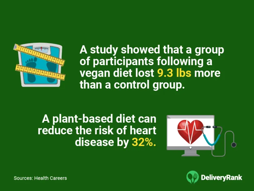 In terms of weight reduction, a study showed that a vegan diet helped participants lose approximately 9.3 lbs more than the control group during an 18-week period. Another study into heart disease showed that those who follow a predominantly plant-based diet are 32% less likely to develop cardiovascular problems.