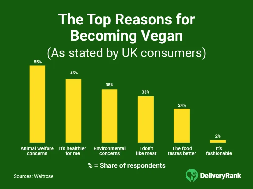 A survey from the UK in 2018 showed that animal welfare concerns were the main reason for adopting a vegan diet, with 55% of responses. Environmental issues were also a key motivation for veganism, expressed as a concern by approximately 38% of respondents.