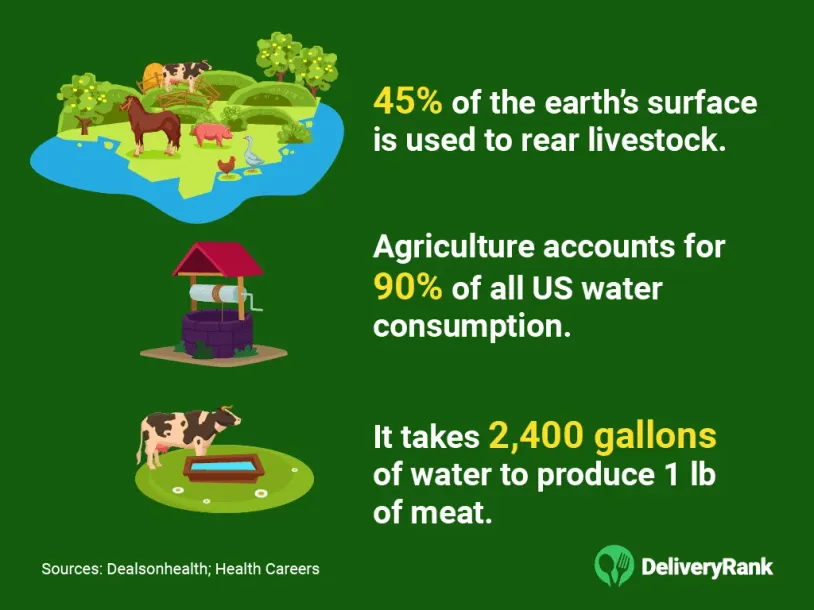Agriculture also accounts for 90% of the total US water consumption. On average, it takes 2,400 gallons of water to produce 1lb of meat. It only takes 25 gallons to produce 1lb of wheat.