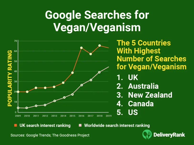 Google searches for “vegan” and “veganism” have increased dramatically over the last few years, particularly between