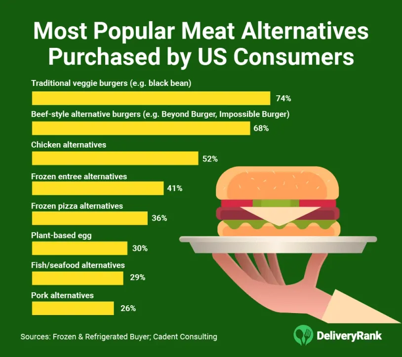 Plant-based burgers are the most popular option of all the vegan meat alternatives, with 74% of US consumers purchasing healthy vegan burgers made with vegetables, legumes, and pulses.