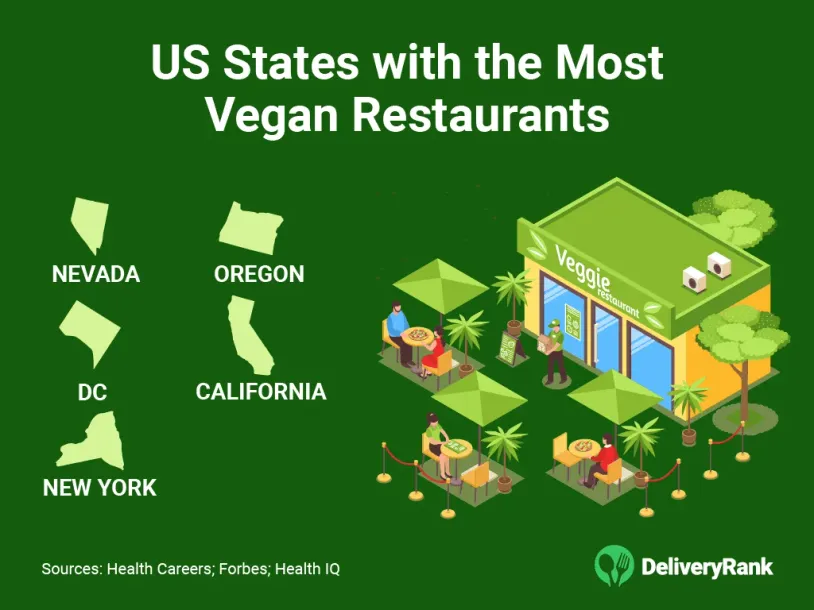 Of all US states, Nevada, Oregon, Washington D.C., California, and New York have the highest number of vegan restaurants. California comes first, with over 300 all-vegan restaurants, followed by New York - home to approximately 166 vegan eateries.